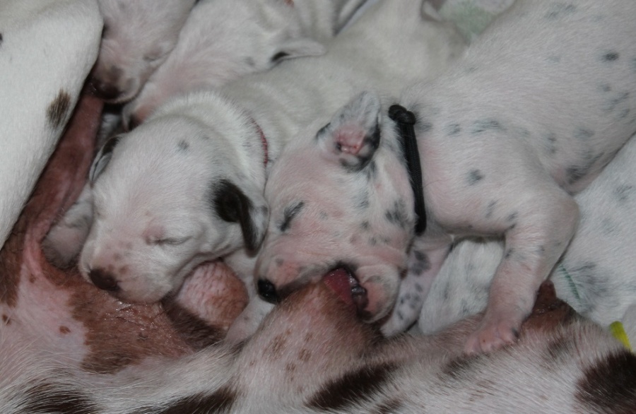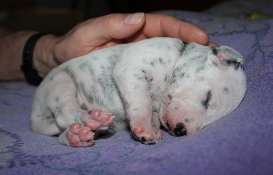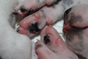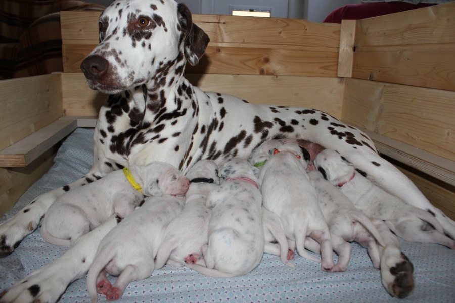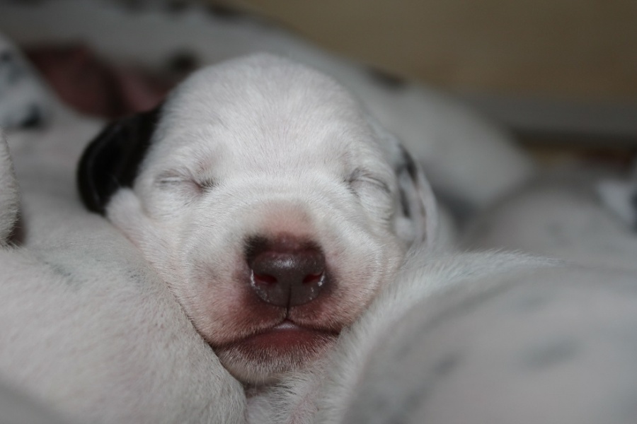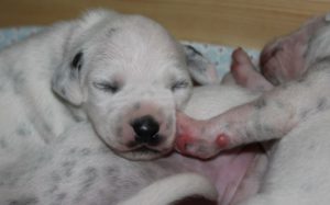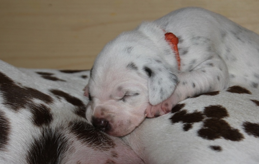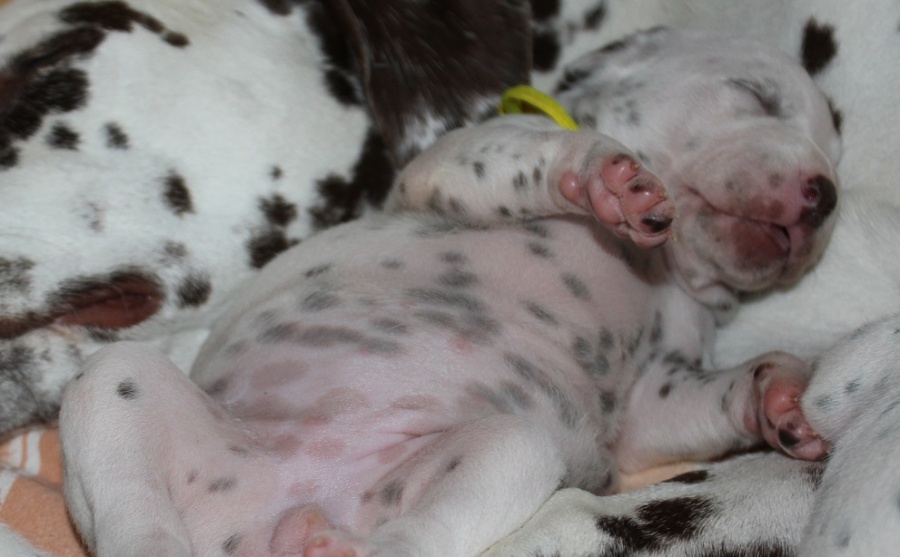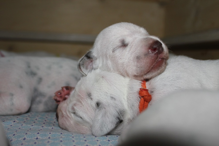 Deborah`s Welpen entwickeln sich prächtig. Am 6. Tag, ihres noch so jungen Lebens, hatten alle ihr Geburtsgewicht verdoppelt. Noch schlafen sie sehr viel, werden aber zusehens aktiver. Sie heben ihre Köpfchen oder versuchen sich auf den Hinterbeinen abzustützen. Herr Schwarz blinzelt mich schon etwas an und Fräulein Orange hat schon einige Male versucht über ihre Mutter zu klettern. Es ist so schön das alles zu beobachten; eine zauberhafte Rasselbande und eine wunderbare, geduldige Mama!