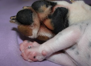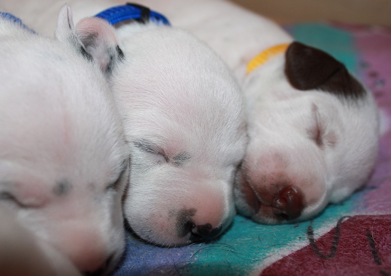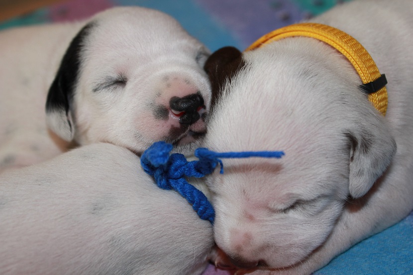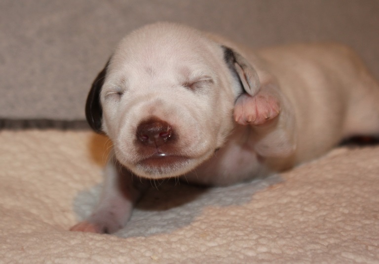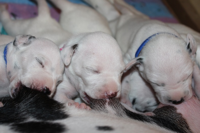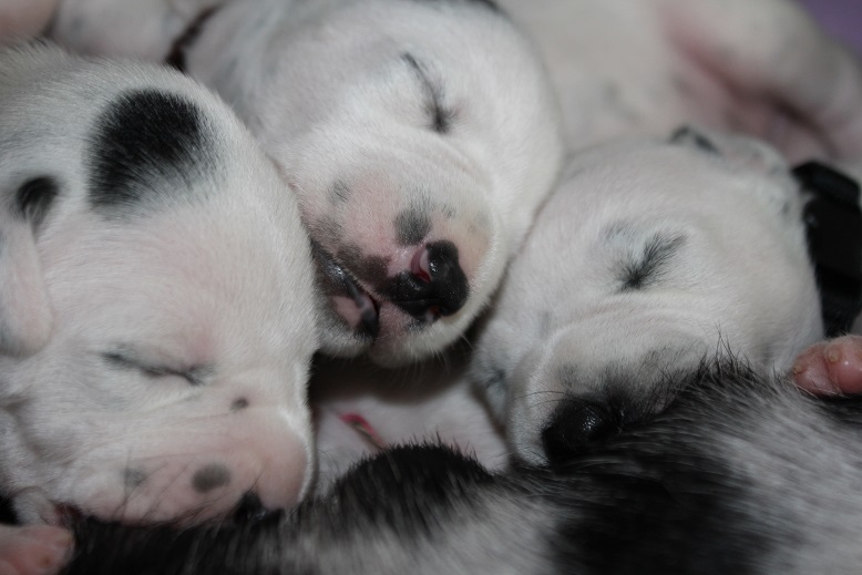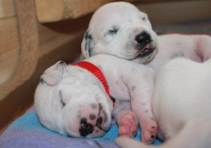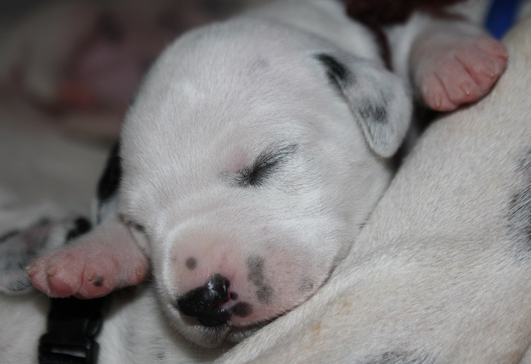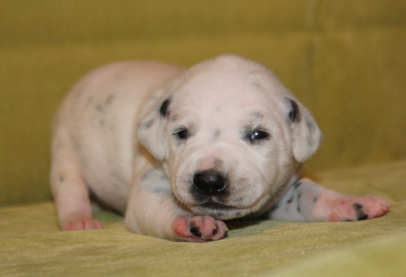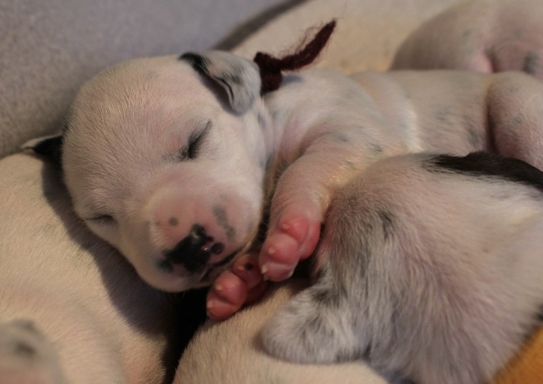 Die kleinen „Thüringer Weißwürstchen“ gibt es nicht mehr. Alle Welpen haben Punkte bekommen und wollen kleine Dalmatiner werden. Die Pikmentierung ist jeden Tag mehr zu sehen ; es hat den Anschein als seien alle mittelstark getupft.